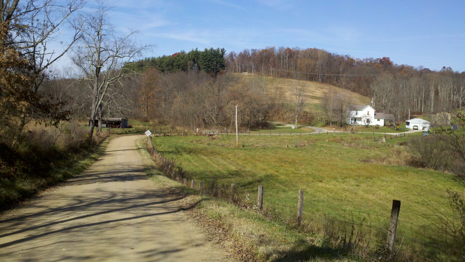 It is the start of hunting season and I must have seen 50+ hunters today. If you aren't driving a pick up truck and dressed in deer-kill orange, then you definitely stand out. Put a guy in spandex, plop him on a bicycle and stick him out in this area ... well, I got a lot of stares today. This is definitely rural Appalachia. It has a certain feel or characteristic to it that differs from other part of rural Ohio. Poverty is widespread here too and lots of folks scratching out a living just above the poverty line. There just isn't a lot of opportunity down here. Trailers and "less" are everywhere. But the region is gloriously scenic. It is laced with backroads galore and is rather hilly. Occasionally you'll luck out with a road that follows a drainage valley, but mostly you are going up or going down. The dirt lacks maintenance gravel and was firm in the cold, but got squishy in the warm sun.